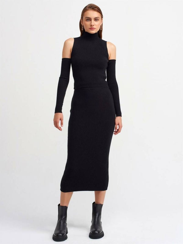 Open schouder Trui met 3/4 Rok Roodbruin.